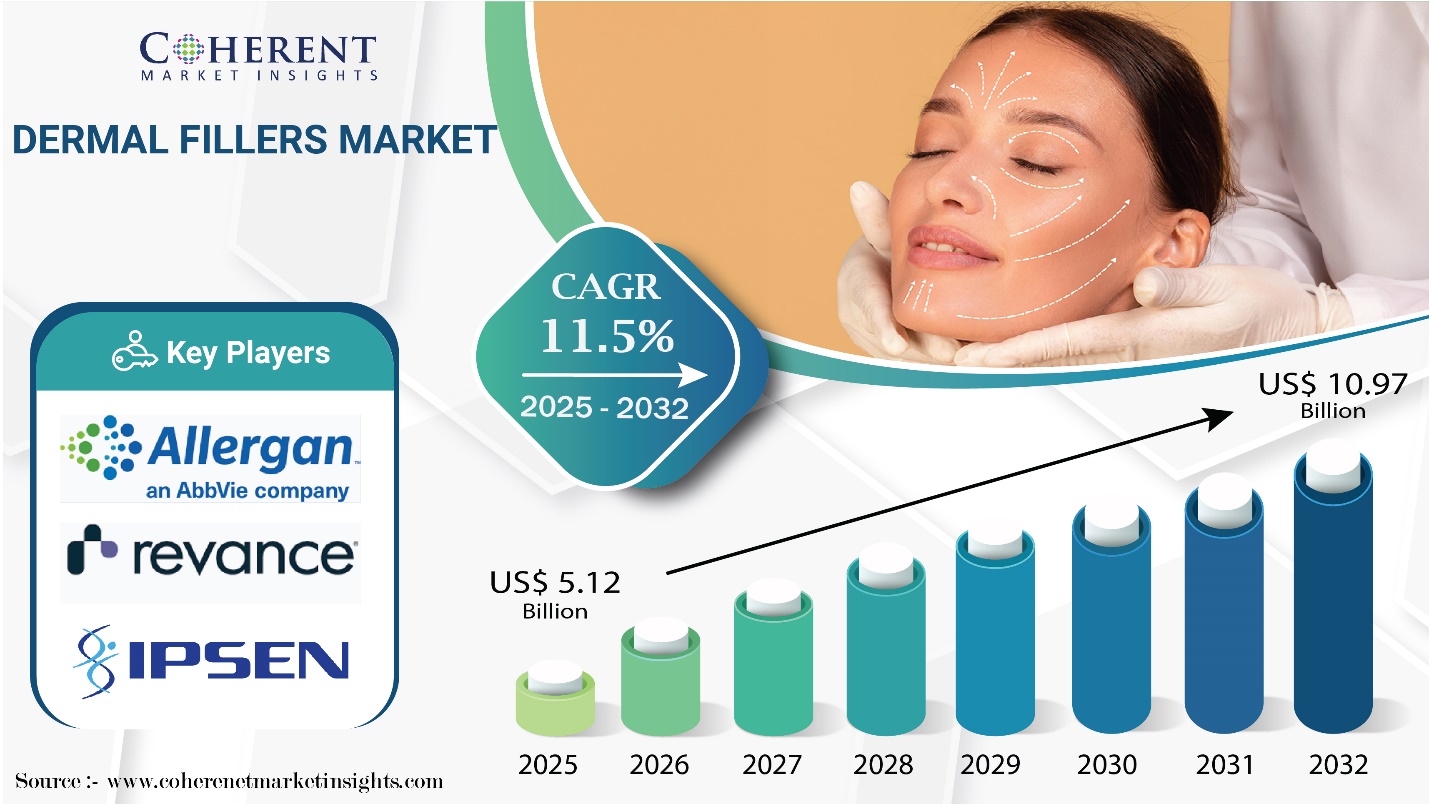 Burlingame, CA, Oct. 08, 2025 (GLOBE NEWSWIRE) -- The Global Dermal Fillers Market is estimated to be valued at USD 5.12 Bn in 2025 and is expected to reach USD 10.97 Bn by 2032, exhibiting a compound annual growth rate (CAGR) of 11.5% from 2025 to 2032. This notable growth is fueled by the rising consumer preference for minimally invasive cosmetic treatments and the increasing global awareness of aesthetic enhancement options. Additionally, technological advancements and the introduction of innovative filler products with enhanced safety features are further propelling market expansion.